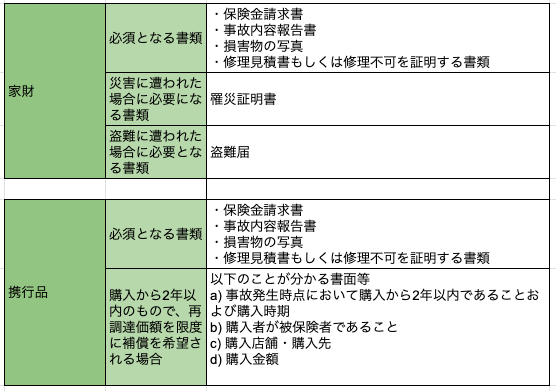 ※下記はあくまでも一例です。なお、個人賠償責任補償特約および借家人賠償責任補償特約のご請求の場合は個別に当社より必要書類についてご案内いたします。